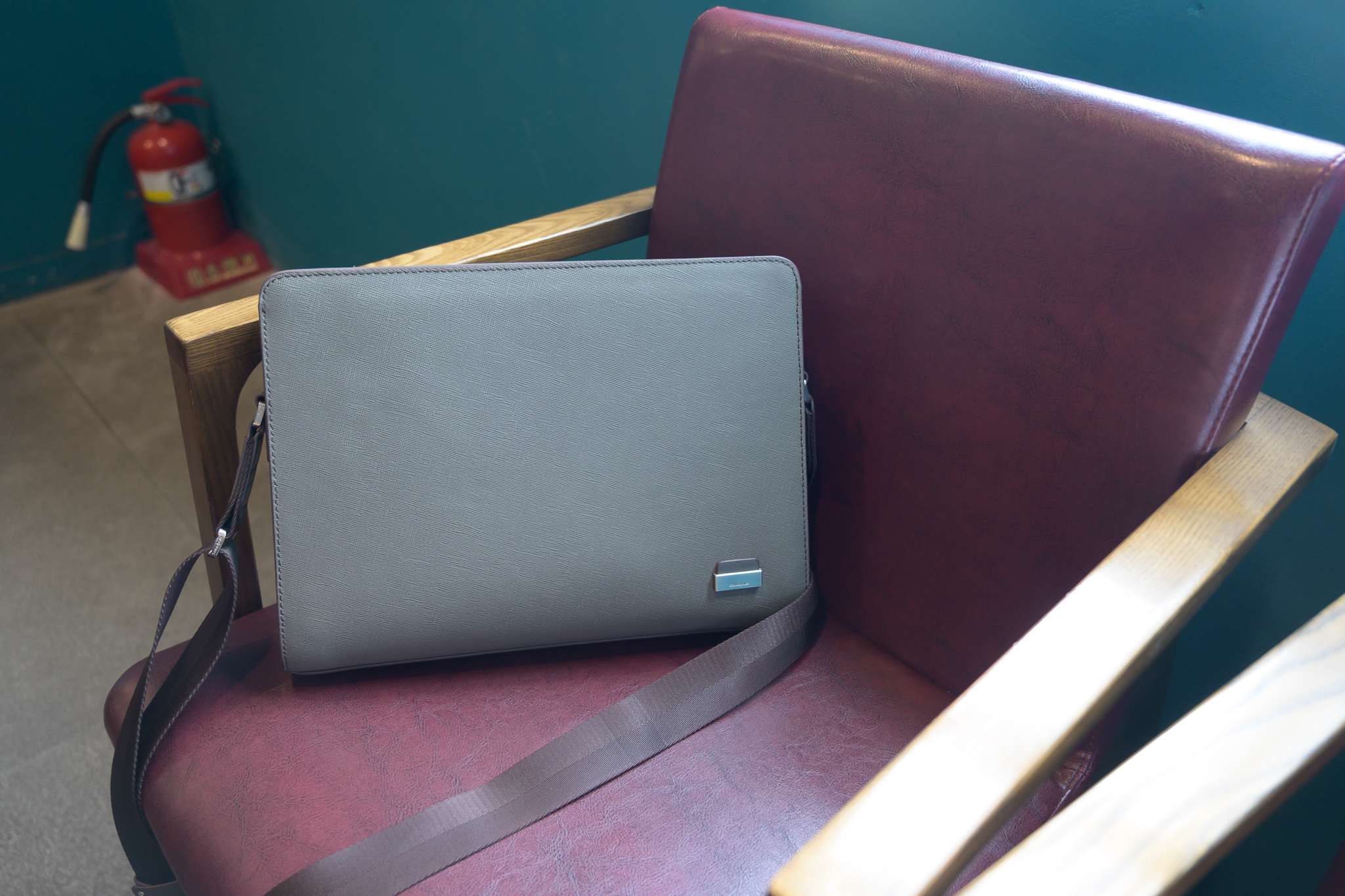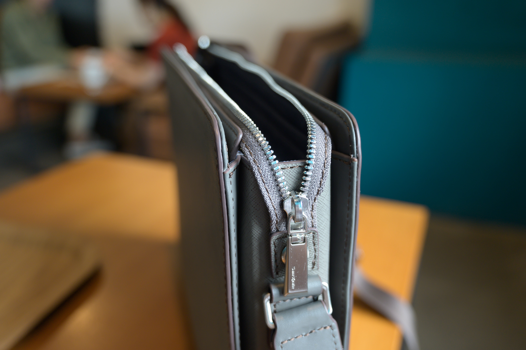 (초점 잃은) 버클 사진입니다. 버클 부분은 갈색으로 그레이와 색 조합이 잘 맞아서 고급스러움을 연출하지만, 한 가지 아쉬운 점은 스트랩 부분에 미끄럼 방지 처리가 안되어 있어 어깨에서 잘 흘러내리는 것입니다.