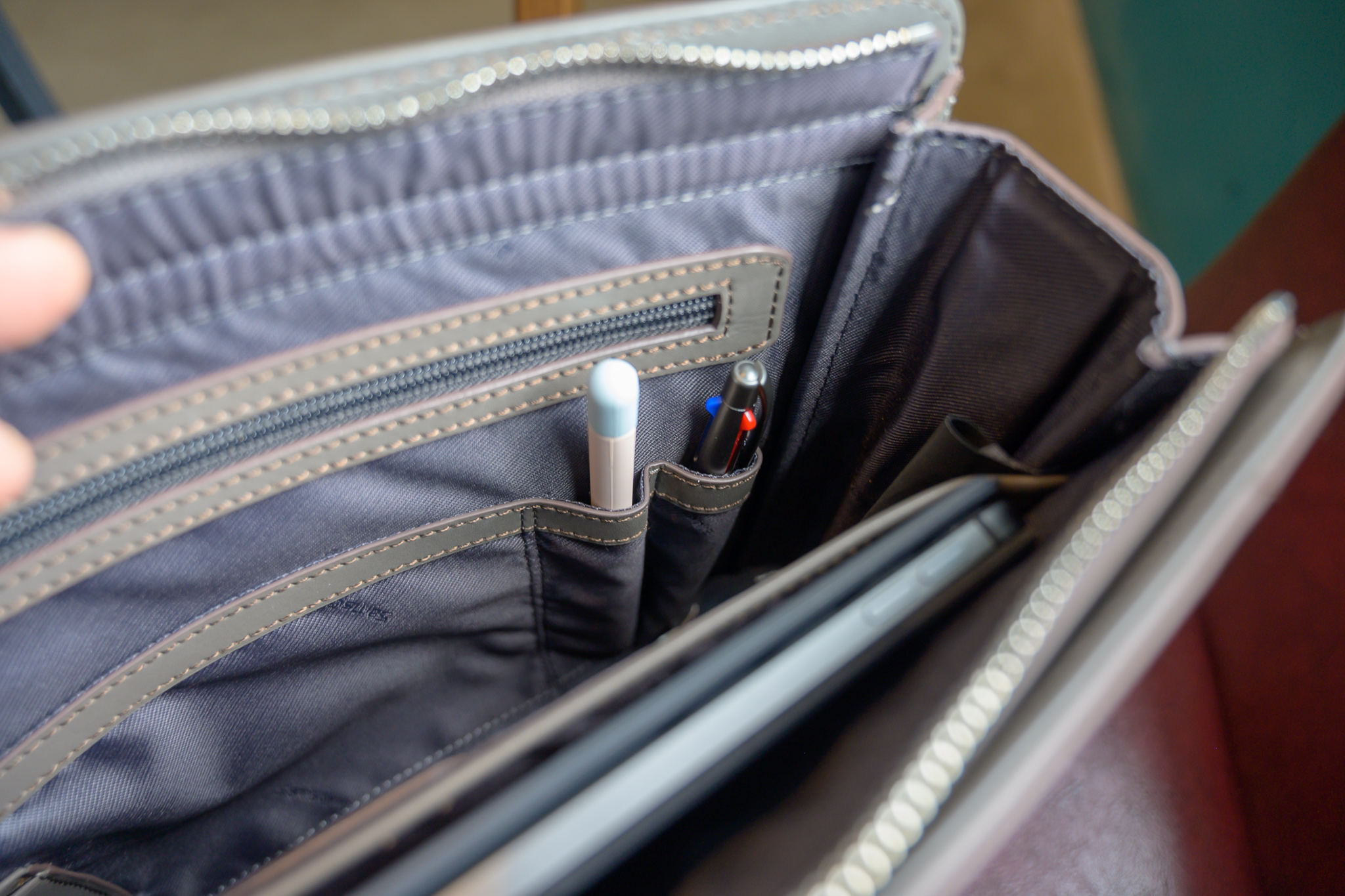 그리고 볼펜 칸에 실제 볼펜과 애플펜슬을 함께 수납하고 있습니다. 이유는 가방에서 지갑 등을 꺼낼 때 계속 팬슬을 건들이게 되어 펜슬이 떨어지더라구요. 그래서 그냥 볼펜칸에 넣고 다니는데 저게 훨씬 좋은 것 같습니다.