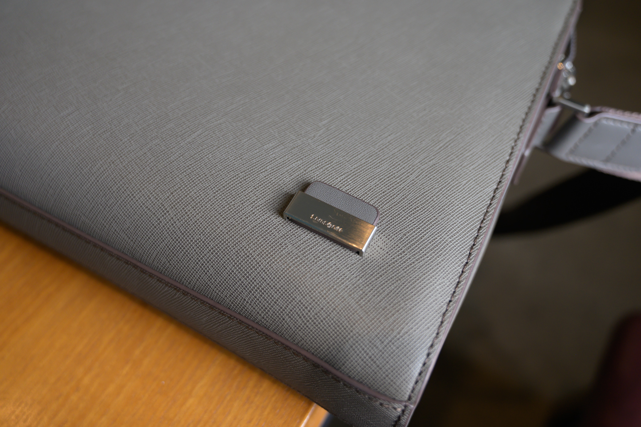 그리고 이 가방의 재질은 사피아노 엠보 가죽입니다. 샘소나이트가 저가형 가방에는 가죽 소재를 잘 사용하지 않는데, 이 제품은 가죽으로 디자인이 되었습니다. 출시가가 34만 원으로 싼 편이 아니기 때문에 가죽을 사용한 것이 당연하다는 생각이 들기도 하네요.